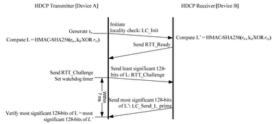 At its heart, the locality check is a pretty simple thing. Let's assume the transmitter and receiver are both trusted, and have successfully established a session key K_d by running the AKE protocol above. The locality check is designed to ensure that the receiver is nearby -- specifically, that it can provide a cryptographic response to a challenge, and can do it in < 7 milliseconds. This is a short enough time that it should prevent people from piping HDCP over a WAN connection.