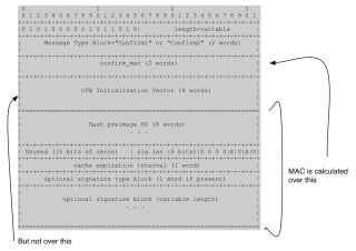 From this point it’s all downhill, or it should be at least. Both parties now have a shared secret that they can use to derive secure encryption and MAC keys. They now construct “Confirm” messages (F8, F9), which they encrypt and (partially) MAC. In principle this exchange gives both parties a chance to detect a mismatch in keys and call the whole thing off.There’s not a ton to say about this section except for one detail: the MAC on these messages is computed only over the encrypted portion (between the == signs below), and leaves out critical details like the Initialization Vector that’s used to encrypt them: ***