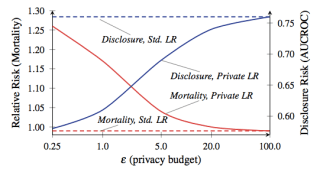 To give an absolutely crazy example of how big the tradeoffs can be, consider this paper by Frederikson et al. from 2014. The authors began with a public database linking Warfarin dosage outcomes to specific genetic markers. They then used ML techniques to develop a dosing model based on their database — but applied DP at various privacy budgets while training the model. Then they evaluated both the information leakage and the model’s success at treating simulated “patients”.