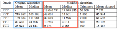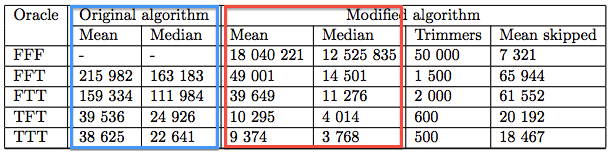 | Total number of decryption queries required to decrypt an RSA-PKCS#1v1.5-encrypted symmetric (AES) key. ‘Original algorithm’ (blue box) shows the mean/median performance of the standard Bleichenbacher attack. ‘Modified algorithm’ (red box) is the mean/median performance of the new, optimized algorithm. Note that the specific implementation of the padding check (FFF/TTT etc.) makes a huge difference in the cost. (source) |