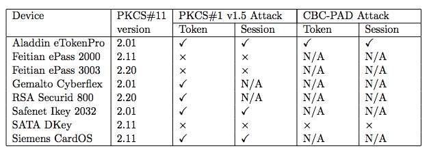 Here’s the postage stamp version: due to a perfect storm of (subtle, but not novel) cryptographic flaws, an attacker can extract sensitive keys from several popular cryptographic token devices. This is obviously not good, and it may have big implications for people who depend on tokens for their day-to-day security. If that describes you, I suggest you take a look at this table:
