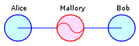 | Man in the Middle attack (image credit: Privacy Canada via Wikipedia). Mallory convinces Alice and Bob to use her key, then transparently passes messages between the two. |