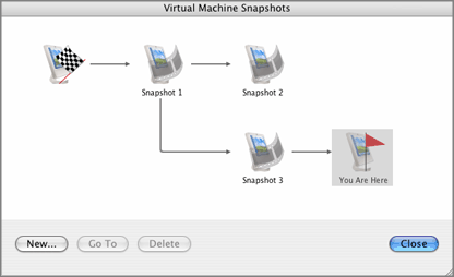 | Example of rewinding through VM snapshots. An initial VM is played forward, rewound to an initial snapshot, then execution is forked to a new path. |