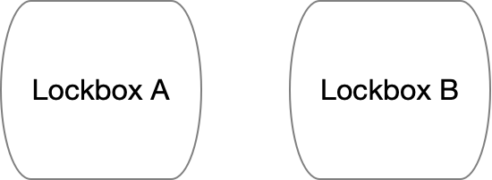 The picture above shows you what’s inside each lockbox. But you need to remember that to anyone other than Alice, lockboxes are kind of a black box. That is, they don’t reveal the key or password they’ve set up with — until the lockbox is queried on a specific password. To exploit this fact, Alice can shuffle the two lockboxes’ and send them to Bob in a random ordering. Until he tries to access one, these lockboxes will look like this to Bob: