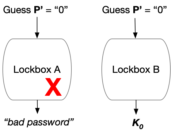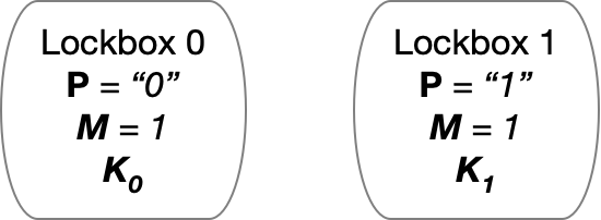 Imagine that Alice has access to two different (fresh) counter lockboxes, as illustrated below. Let’s assume she configures both lockboxes to permit exactly one password attempt (M=1). Next, she stores the string K0 into the lockbox on the left, and sets it up to use password “0”. She then places the string K1 into the lockbox on the right and set it up with password “1”, as follows:
