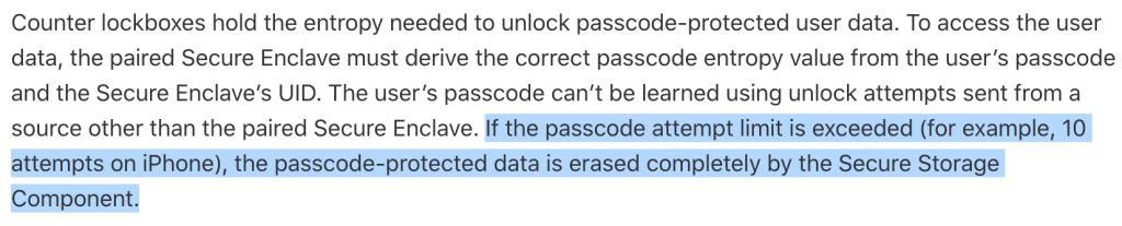 Reading through documentation reveals one functionality that isn’t exactly what we need, but at least has some promise. In its documentation, Apple calls this function a “counter lockbox“, and it’s designed to store encryption keys that are protected with a user-selected password. The same person (or someone else) can later retrieve the key by sending in the right passcode. In the event that the entered passcode is not the right one, the lockbox increments an “attempt counter” that caps the number of incorrect guesses that will be permitted before the key is locked forever.